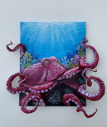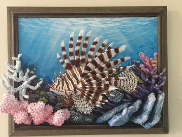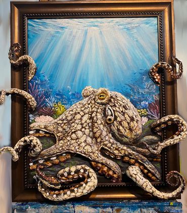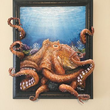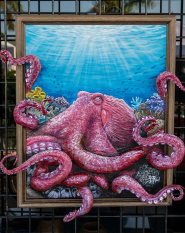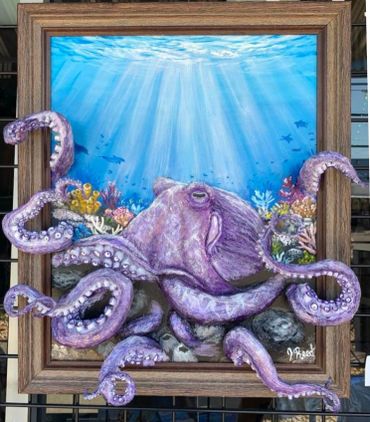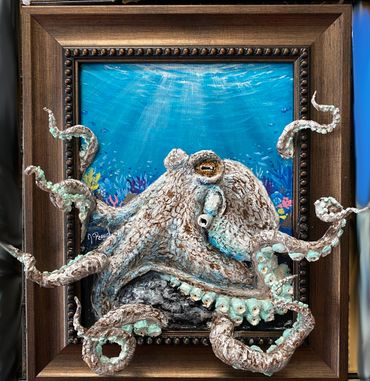 Combining his vibrant sea life paintings with his unique tissue sculpting, Jeremy creates stunning 3-D art that is literally climbing out of the frame! These popular, one-of-a-kind pieces have been a hit! More will be coming!